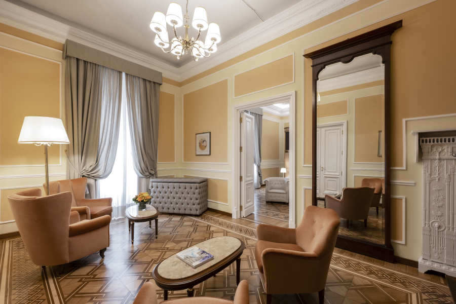 Una caratteristica della struttura che salta subito all’occhio è l’assenza di quel contrasto forzato che spesso si cerca per ostentare la contemporaneità. Servizi come aria condizionata e riscaldamento regolabili autonomamente, cassette di sicurezza, Tv satellitare e minibar si integrano allo stile Liberty con discrezione, senza mai sovrastarlo.
