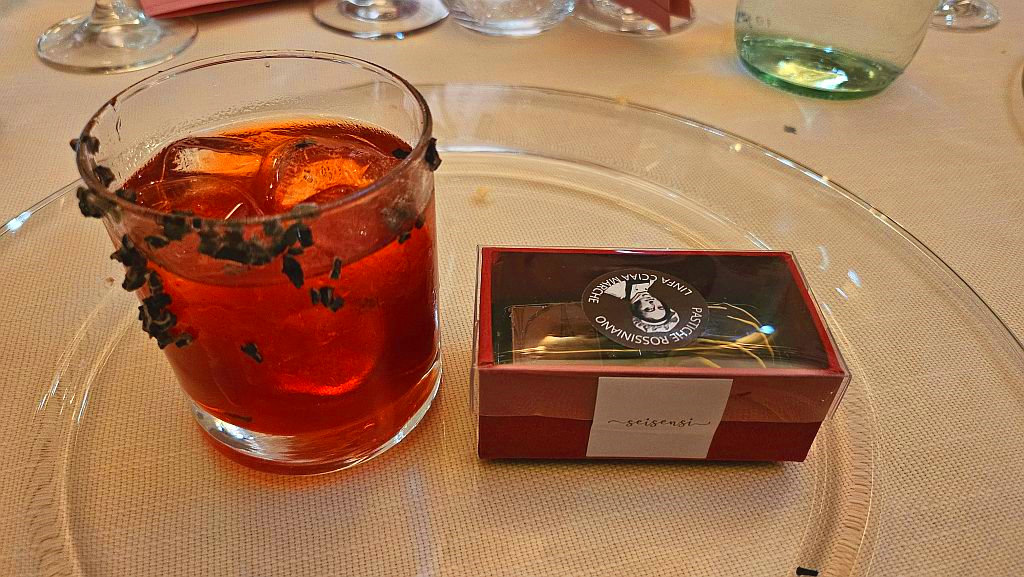 In chiusura, lo show cooking dello chef Daniele Citeroni (Osteria Ophis, Alleanza Slow Food), collegato in streaming dalle Marche, che ha proposto una reinterpretazione della Barbajada in chiave marchigiana, abbinata al Negroni Rossini (vedi foto sotto): cocktail simbolico, realizzato con gin botanico e cioccolato artigianale marchigiano, emblema di un format capace di unire memoria e innovazione, arte e impresa.