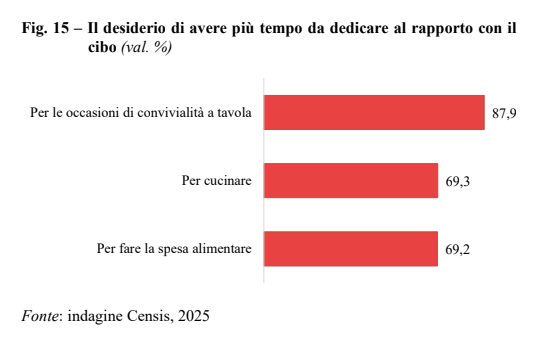 Il 70,2% degli italiani desidera rallentare il ritmo delle proprie attività. Il cibo si conferma un punto di riferimento fondamentale: il 95,3% degli italiani considera importante il tempo trascorso a tavola in compagnia, l’87,9% vorrebbe poterne avere di più. Inoltre, il 69,3% desidera più tempo per cucinare e il 69,2% per fare la spesa in modo più consapevole.La convivialità rappresenta un momento di pausa rigenerante, un’esperienza di relazione e identità. Tuttavia, nella quotidianità il tempo medio dedicato ai pasti nei giorni feriali è di appena 60 minuti complessivi (28 per il pranzo, 32 per la cena). Nel weekend si arriva a 75 minuti, ma la distanza tra desiderio e realtà resta ampia. Anche il tempo medio dedicato a cucinare è contenuto: 32 minuti nei feriali, 39 nei festivi.