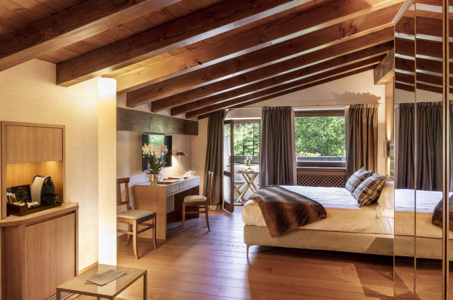 Attivo nella stagione estiva dal 27 giugno al 31 agosto, l’Hermitage si distingue per un modello di ospitalità che coniuga identità territoriale, cura del dettaglio e servizi evoluti. L’architettura dell’edificio – chalet in pietra locale e legno scuro – rimanda alle forme della tradizione valdostana, restituendo un’atmosfera sobria ma riconoscibile. Le 28 camere e 11 suite mantengono la coerenza con lo stile originario, con alcune unità recentemente oggetto di restyling. Gli interventi hanno introdotto soluzioni progettuali contemporanee per aumentare la funzionalità e il comfort, senza alterare la struttura esistente.