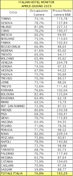 Per quanto riguarda il prezzo di vendita, al vertice del ranking Top 10 si conferma Venezia, con un prezzo medio camera di 264,78 euro (+1,4% rispetto allo scorso anno), davanti a Firenze (230,58 euro, +1,1% sul 2024), Milano (227,12 euro, +8,0% sul 2024) e Roma (209,54 euro, +8,5% sul 2024). Per quanto riguarda gli incrementi medi di prezzo più significativi, si segnalano Taranto (+12,9% medio), Trieste (+10,6%) e Perugia (+10,1). Ma nei segmenti specifici sottolineiamo il +14,2% degli hotel midscale di Perugia, il +13,7% degli hotel midscale di Genova, mentre per la categoria upscale “svettano” Bolzano (+12,7%) e Trieste (+11,3%).