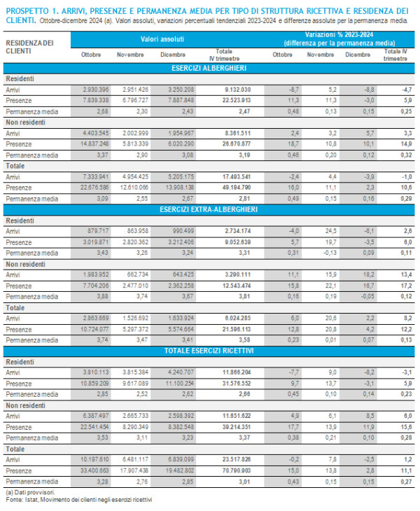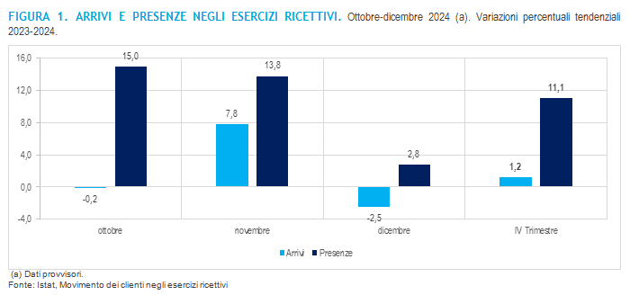 Secondo i dati provvisori dell’indagine Istat “Movimento dei clienti negli esercizi ricettivi”, il quarto trimestre 2024 presenta una performance molto positiva, in particolare per l’andamento delle presenze negli esercizi ricettivi: complessivamente rispetto al medesimo periodo del 2023 le presenze aumentano infatti dell’11,1% e gli arrivi crescono dell’1,2%