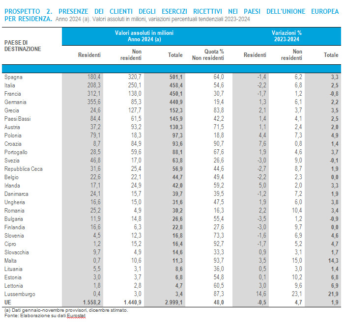 La crescita dell’Italia (+2,5%), in linea con quella della media Ue, porta il nostro Paese al secondo posto nella classifica dei partner europei in termini di presenze totali, superando la Francia (450,1 milioni di presenze) e dietro solo alla Spagna (501,1 milioni di presenze).