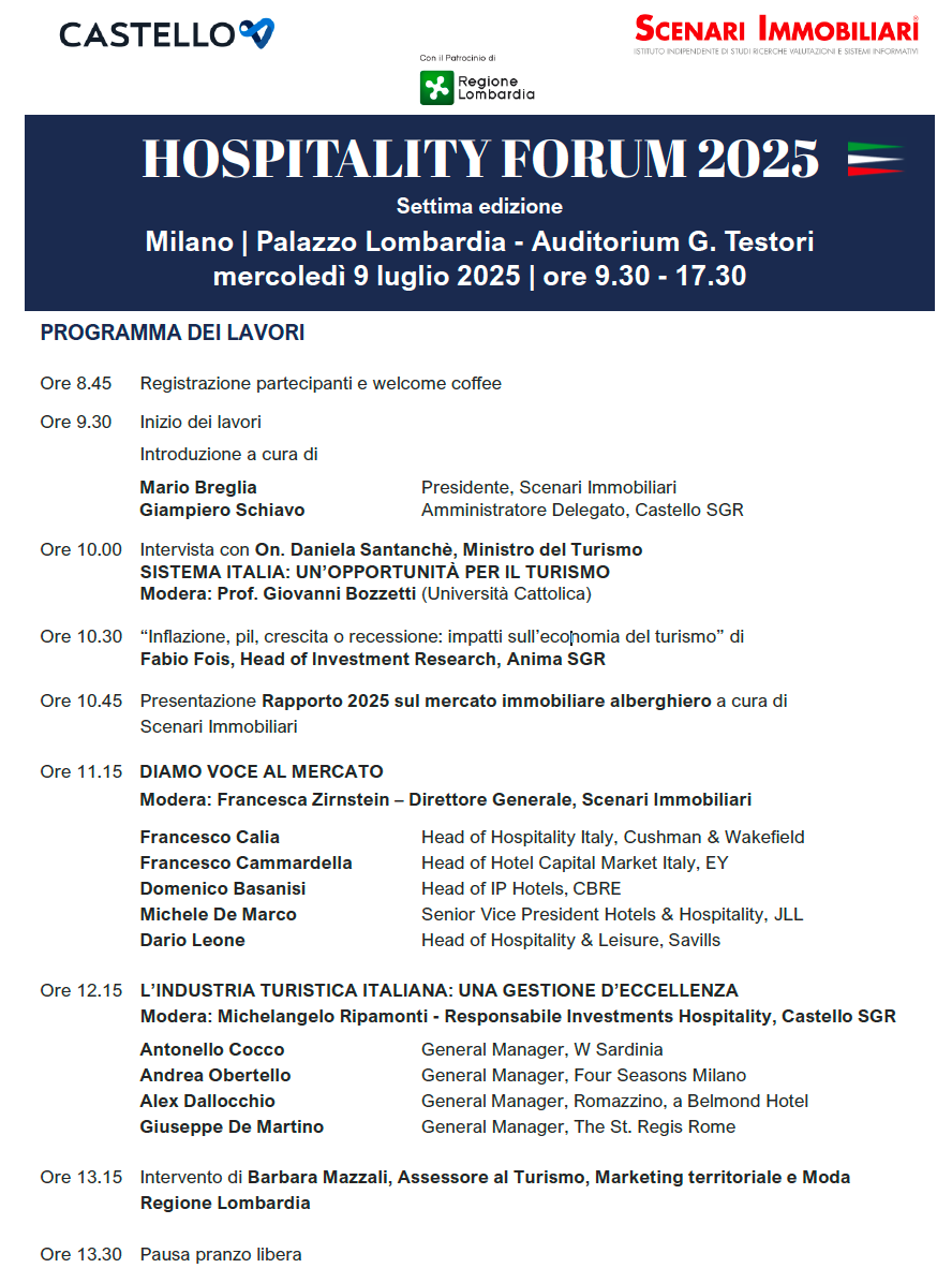 Ad HOSPITALITY FORUM 2025  verrà presentato Rapporto 2025 sul mercato immobiliare alberghiero a cura di Scenari Immobiliari in collaborazione con Castello Sgr. Si terrà mercoledì 9 luglio dalle 9.30 alle 17.30 al Palazzo Lombardia – (piazza Città di Lombardia – Auditorium Testori)