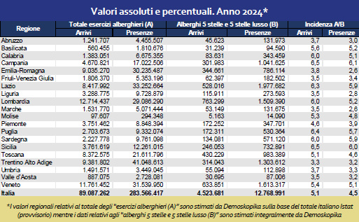 • la quota di presenze in hotel 5 stelle sul totale regionale;
