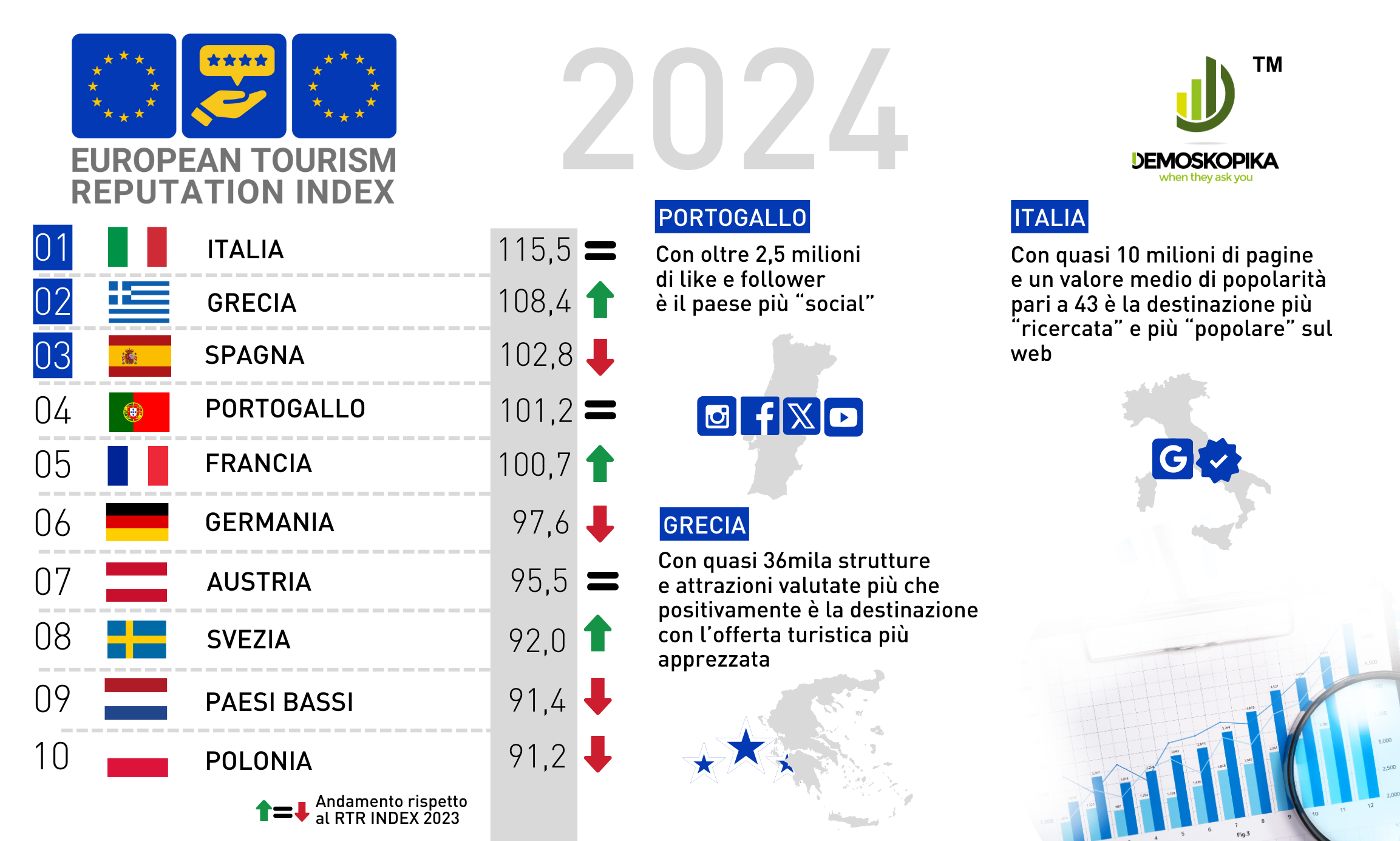 Demoskopika ha analizzato le dieci principali destinazioni turistiche europee, che rappresentano l’84,7% degli arrivi UE nel 2023, con oltre 863 milioni di arrivi e 2,5 miliardi di pernottamenti. L’Italia, con 115,5 punti, mantiene la leadership davanti a Grecia (108,4 punti) e Spagna (102,8 punti). La Grecia si distingue per la qualità della sua offerta turistica e la forte presenza sui social, mentre la Spagna eccelle nella ricerca online.