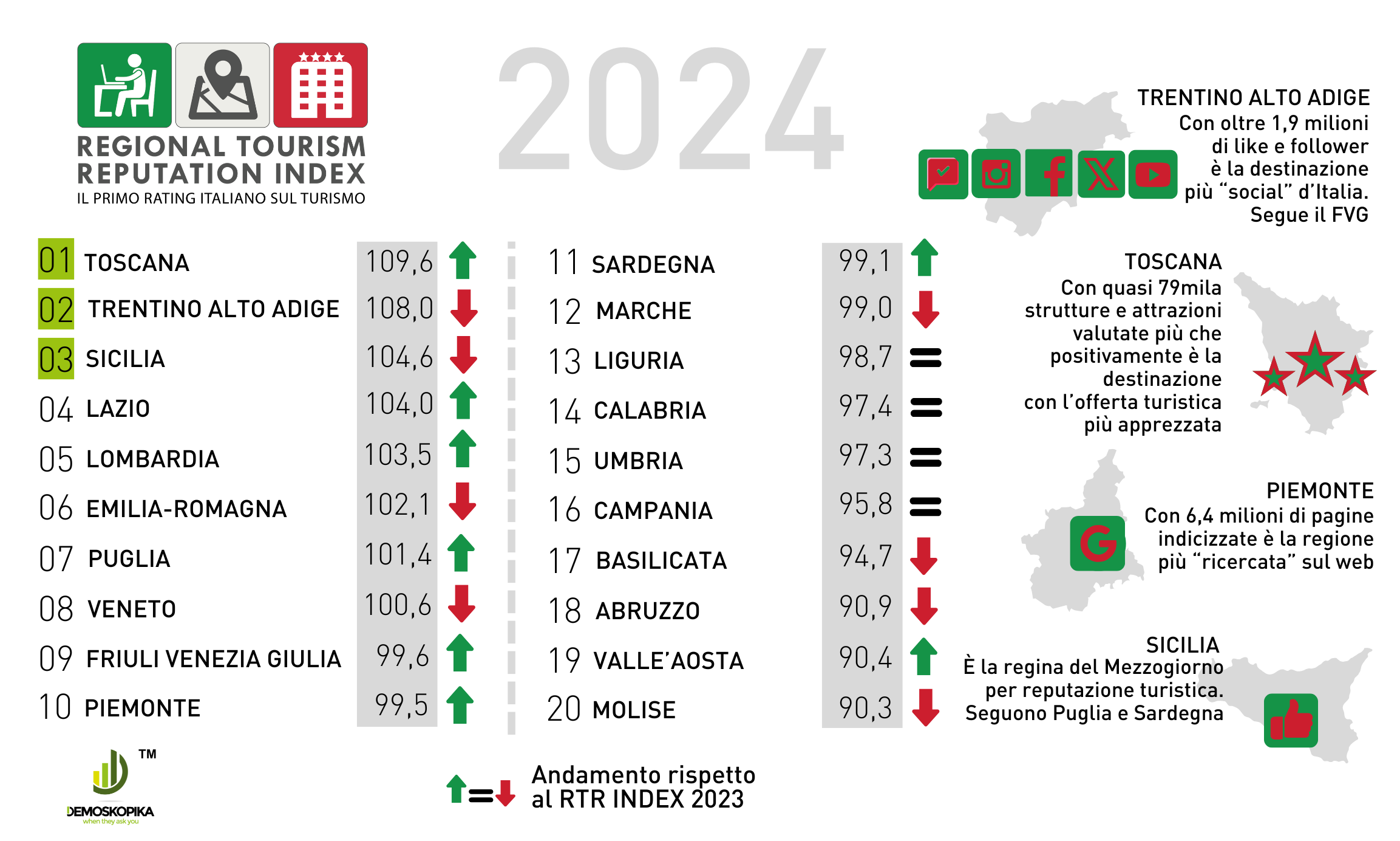 Su base regionale, la Toscana conquista il vertice del Regional Tourism Reputation Index, superando il Trentino-Alto Adige (ora secondo, ma primo nel rating di qualità dell’offerta turistica) grazie alla maggiore popolarità online e all’alta valutazione della sua offerta turistica. Terza la Sicilia, sostenuta dall’elevata reputazione delle sue strutture e dalla visibilità su Google Trends. L’indagine ha considerato elementi chiave come la visibilità dei portali turistici regionali, il social appeal e il livello di apprezzamento per l’offerta ricettiva e culturale.