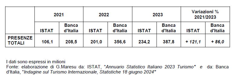 Tabella 2 – Presenze turistiche internazionali in Italia 2021/2023 Dati a confronto ISTAT/Banca d’Italia