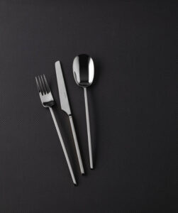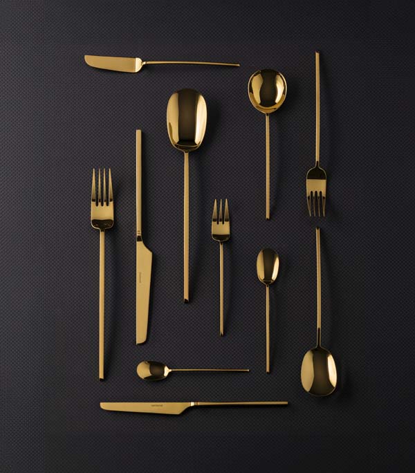 Dal punto di vista materico, l’acciaio inox viene declinato nella finitura lucida e nella variante PVD oro, intercettando sia contesti di alta ristorazione classica sia ambienti più orientati a una mise en place calda e scenografica. La gamma si estende oltre il servizio base, includendo accessori coordinati e soluzioni pensate per una tavola sempre più ibrida, aperta a contaminazioni culturali, come dimostra l’introduzione di set di bacchette.