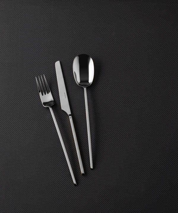 La collezione si caratterizza per un disegno essenziale, dove ogni elemento risponde a una logica di sottrazione. L’impugnatura, sottile e leggermente arcuata, definisce una linea fluida che accompagna il gesto, mentre le coppe di forchetta e cucchiaio introducono un contrappunto volumetrico che garantisce stabilità. Il coltello, con lama geometrica in continuità con il manico, rafforza la coerenza progettuale, pur mantenendo una propria autonomia espressiva. Il risultato è una posata che lavora per equilibrio, evitando ogni ridondanza decorativa.