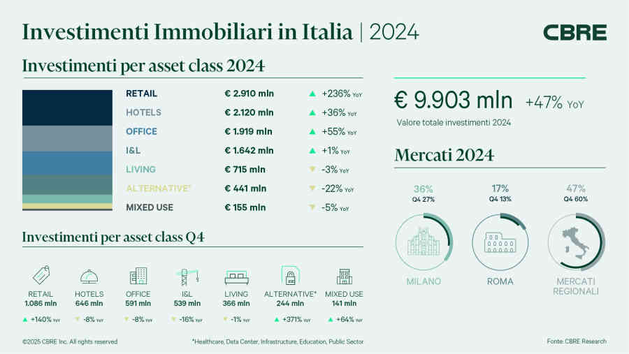 I volumi d’investimento del commercial real estate italiano nel 2024 vedono un incremento del 47% rispetto all’anno precedente, raggiungendo i 9,9 miliardi di euro. Un contributo rilevante si deve al quarto trimestre, che con i suoi 3,6 miliardi segna una crescita del 23% rispetto allo stesso periodo del 2023. I processi di repricing innescati dall’aumento dei tassi d’interesse della BCE hanno creato opportunità interessanti per gli investitori, in particolare nei mercati più ambiti dagli occupier. La normalizzazione delle politiche monetarie, avviata dalla BCE a giugno, ha stabilizzato i rendimenti nelle asset class primarie, favorendo il ritorno degli investitori.